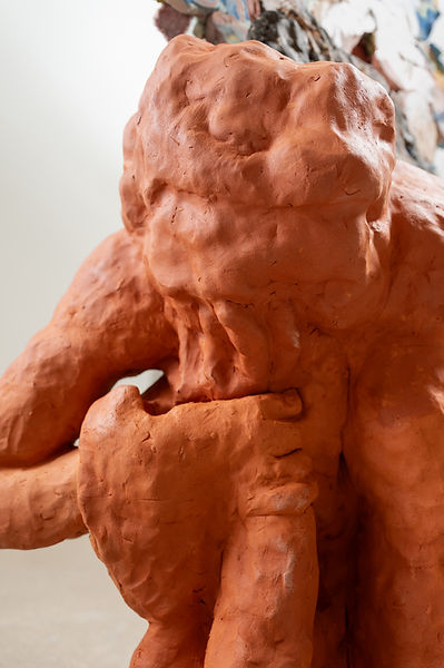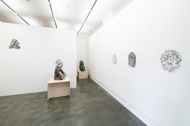 In Lo, A Vase in the Dark, Stacy Jo Scott translates fragments of 3D scans and code-based processes into clay figures, masks, and vessels. Scott parses out digital shards, partial stories, and fragmentary objects and reconstructs them as new bodies, forming new lineages. The collaged works included in the exhibition are formed through the artist's process of imagining a new body woven from the past. Rescanned and reformed through the use of digital processes with clay, the body enters a space of machinic order and is rendered malleable, changeable, inexact, and hollow. Full of holes, gapes, and wounds, the body is represented as sliced and incomplete. Scott’s sculptures and prints portray human physicality as raw material to bend, twist, and reform into new creatures and reimagined bodies through spectral association.