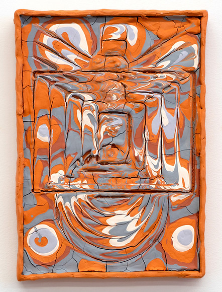 In her statement for the exhibition, Stacy Jo says “These works are drawings etched into dry clay or dragged through wet colored slip using a CNC router and stylus. The underlying framework for the drawings emerges from programming scripts based on descriptions of imperial Roman architecture, which were developed with AI-generated code. I alter, layer, overlap, and amend these simplified interpretations to create imagery that seems at once ancient and speculative, evoking a future yet to come.
